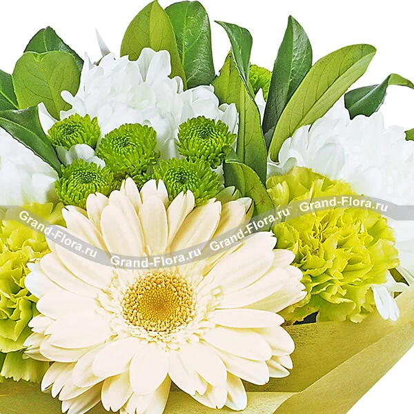 Стандартный: гербера кремовая - 2 шт., гвоздика зеленая - 3 шт., хризантема одноголовая - 3 шт., хризантема зеленая (сантини) - 2 шт., декоративная зелень, фетр желтый, бант белый.