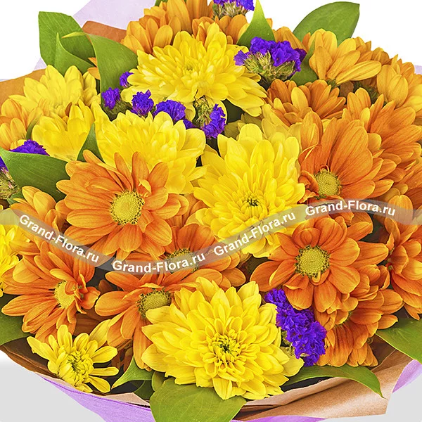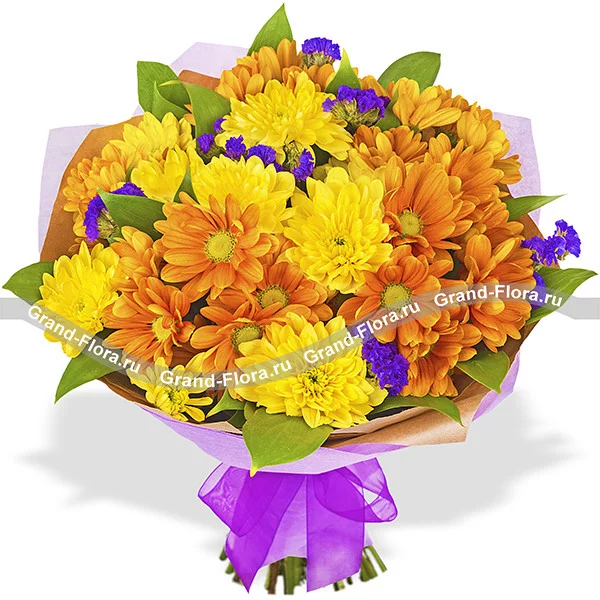 Стандартный: хризантема кустовая жёлтая - 4 шт., хризантема кустовая оранжевая - 3 шт., статица - 3 шт., салал, крафт.