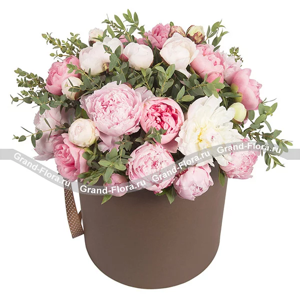 Цветочное искушение - коробка с розовыми и белыми пионами и зеленью